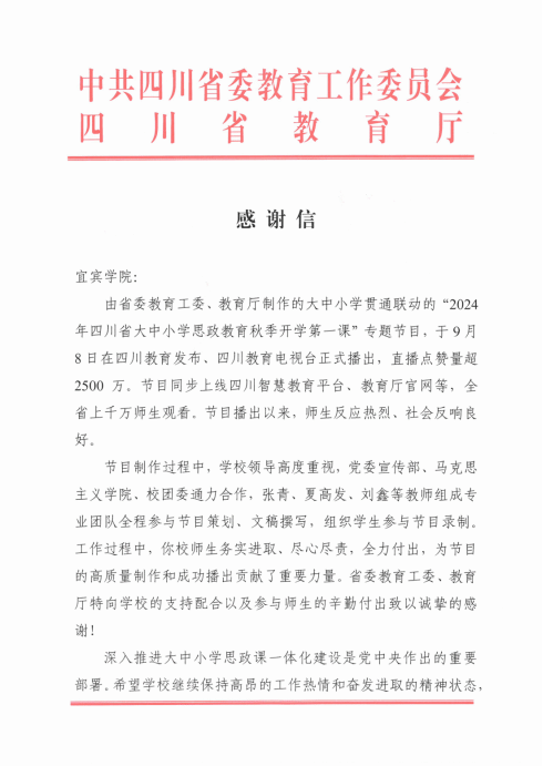 感謝信中指出,由省委教育工委、教育廳制作的大中小學貫通聯動的“2024年四川省大中小學思政教育秋季開學第一課”專題節目于9月8日在四川教育發布、四川教育電視臺正式播出,并同步上線四川智慧教育平臺、教育廳官網等。節目播出以來,師生反應熱烈、社會反響良好。節目制作過程中,宜賓學院領導高度重視,黨委宣傳部、馬克思主義學院、校團委通力合作,張青、夏高發、劉鑫等教師組成專業團隊全程參與節目策劃、文稿撰寫,組織學生參與節目錄制,為節目的高質量制作和成功播出貢獻了重要力量。